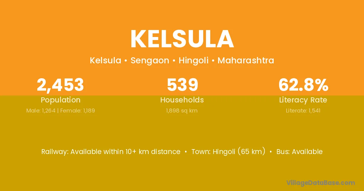 Hingoli (65 km) is the nearest town to Kelsula village for major economic activities and is located approximately 65 km away.