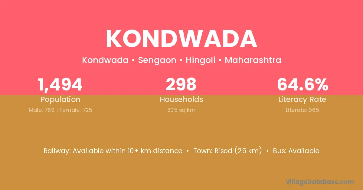 Risod (25 km) is the nearest town to Kondwada village for major economic activities and is located approximately 25 km away.