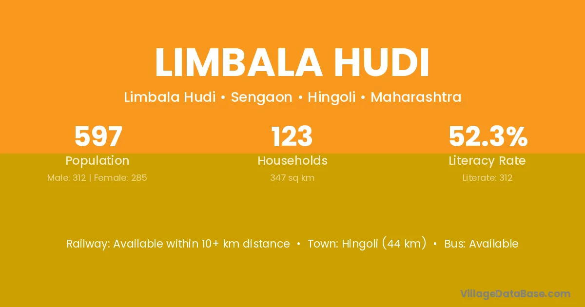 Hingoli (44 km) is the nearest town to Limbala Hudi village for major economic activities and is located approximately 44 km away.