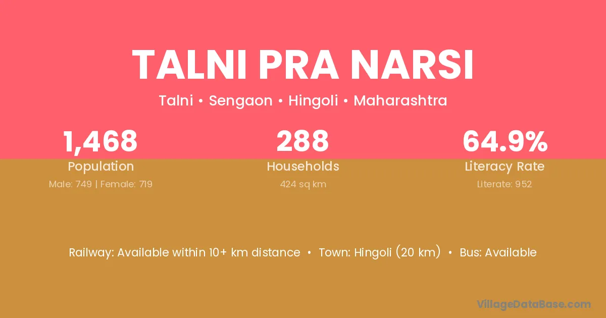 Hingoli (20 km) is the nearest town to Talni Pra Narsi village for major economic activities and is located approximately 20 km away.