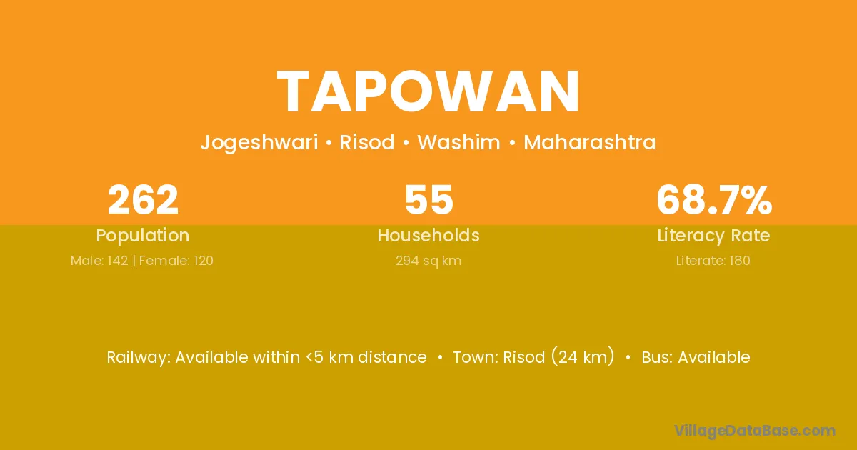 Hingoli (40 km) is the nearest town to Tapowan village for major economic activities and is located approximately 40 km away.