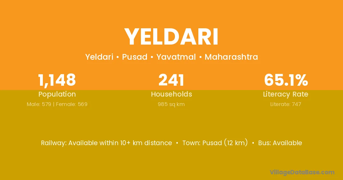 Jintur (15 km) is the nearest town to Yeldari village for major economic activities and is located approximately 15 km away.