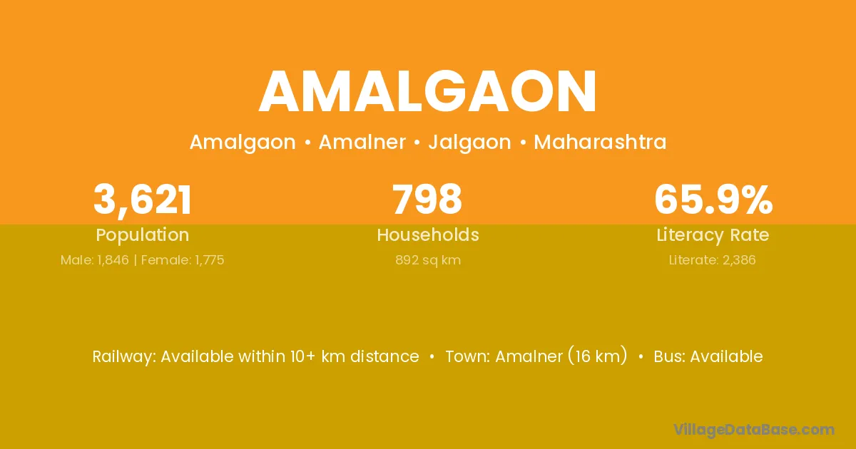 Amalner (16 km) is the nearest town to Amalgaon village for major economic activities and is located approximately 16 km away.