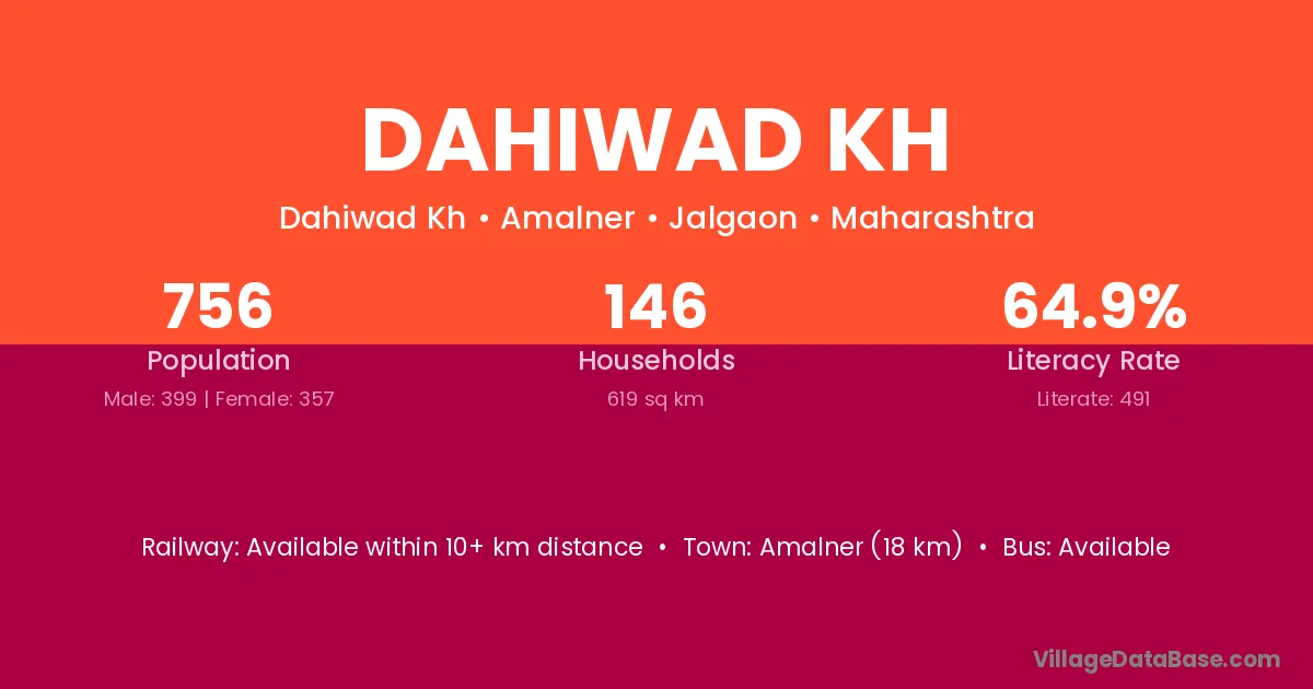 Amalner (18 km) is the nearest town to Dahiwad Kh village for major economic activities and is located approximately 18 km away.