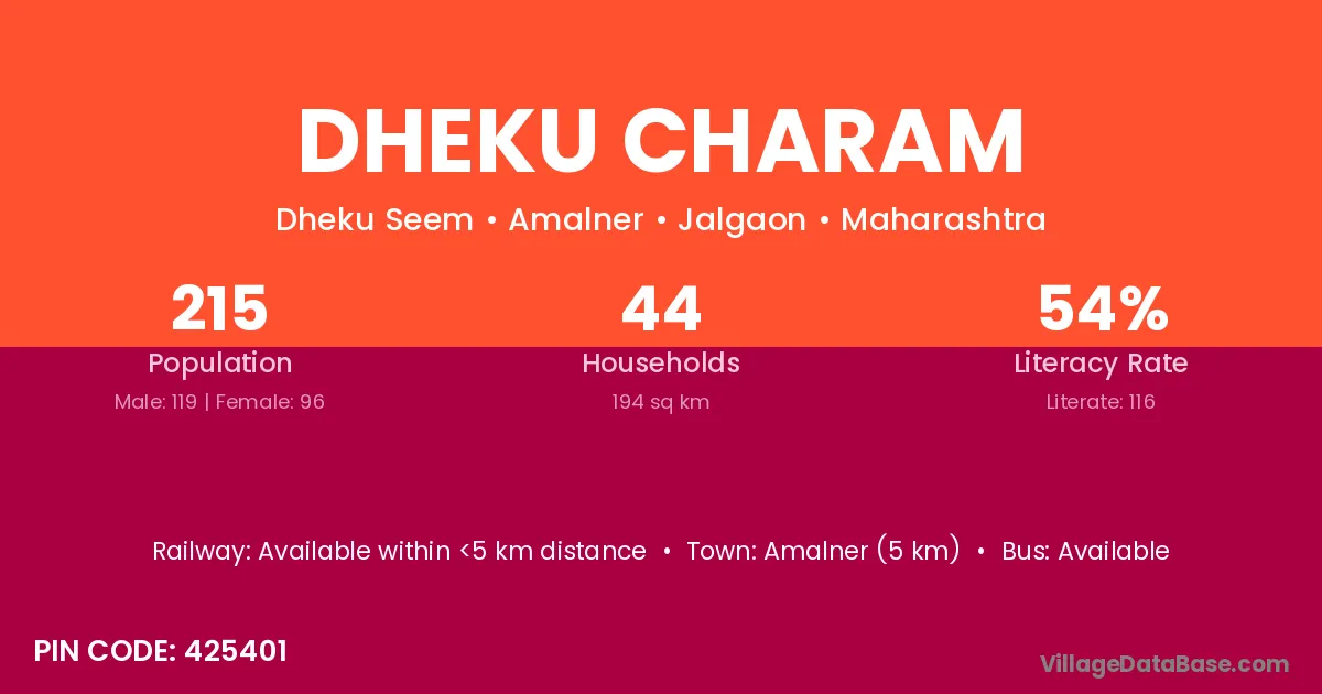 Amalner (5 km) is the nearest town to Dheku Charam village for major economic activities and is located approximately 5 km away.