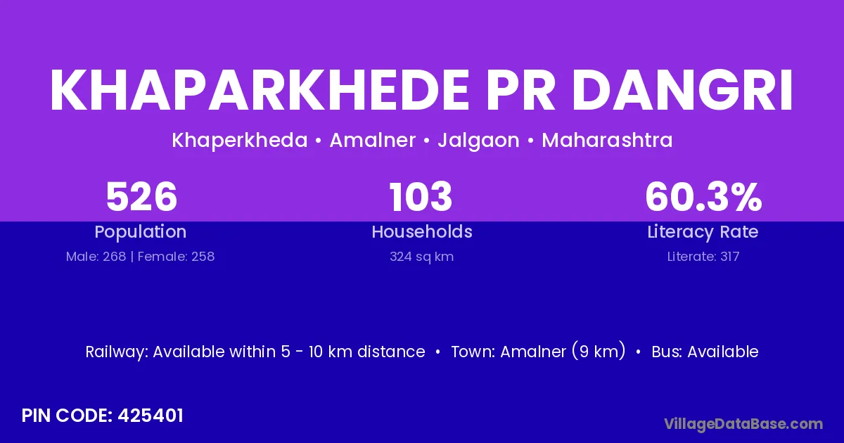 Khaparkhede Pr Dangri village has a total population of 526 people, of which 268 are males and 258 are females.