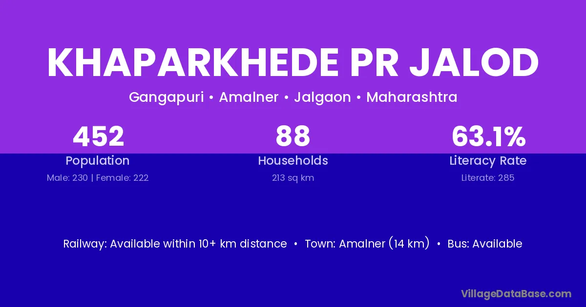Khaparkhede Pr Jalod village has a total population of 452 people, of which 230 are males and 222 are females.