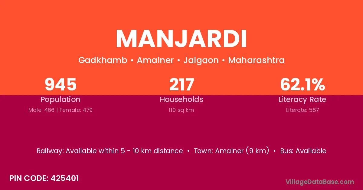 Amalner (9 km) is the nearest town to Manjardi village for major economic activities and is located approximately 9 km away.