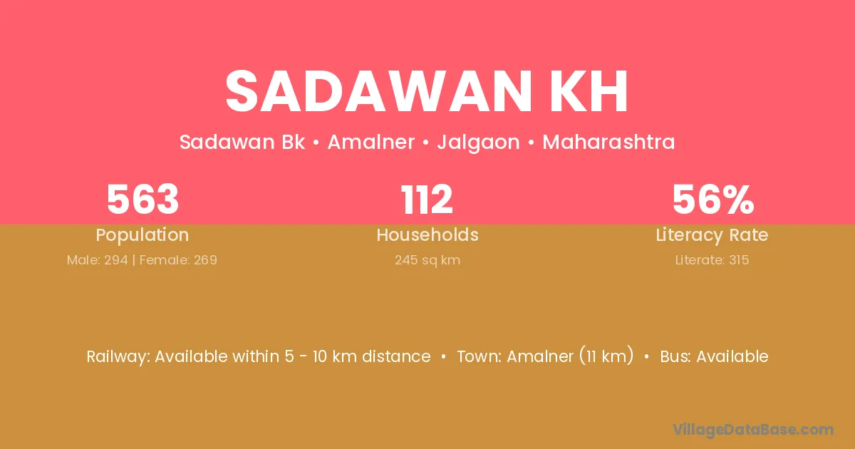 Amalner (11 km) is the nearest town to Sadawan Kh village for major economic activities and is located approximately 11 km away.