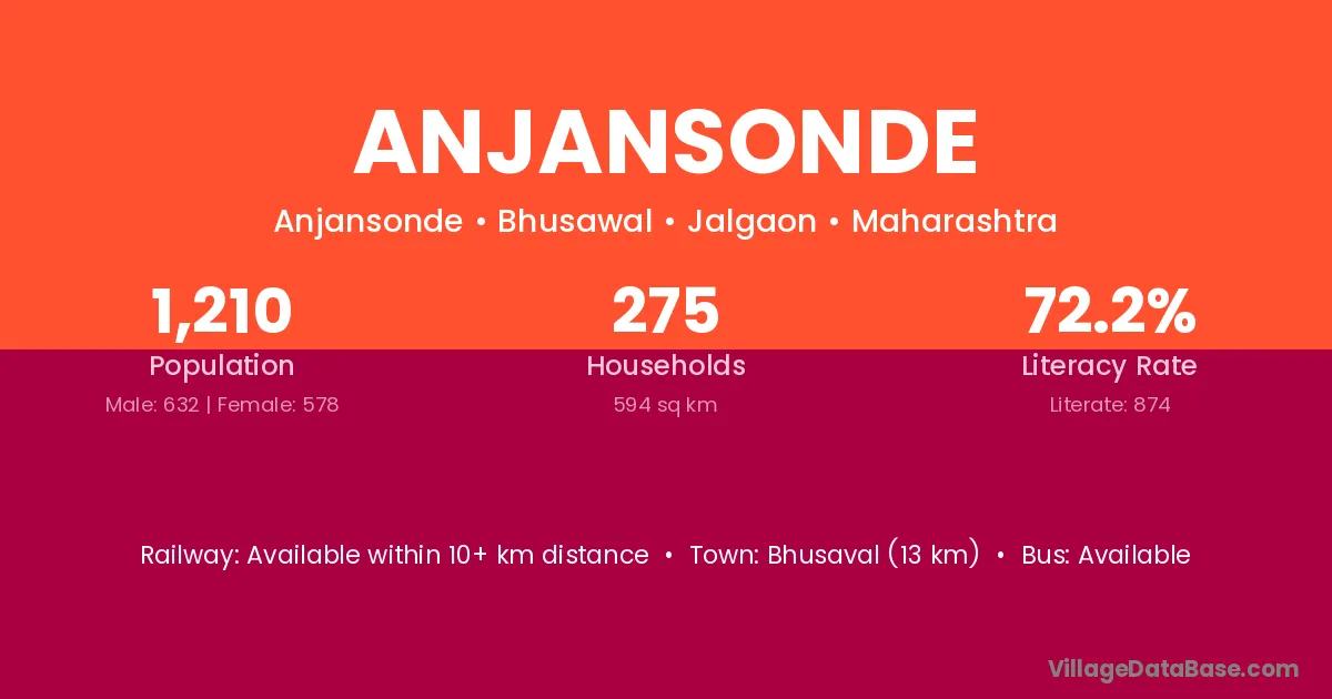 Bhusaval (13 km) is the nearest town to Anjansonde village for major economic activities and is located approximately 13 km away.