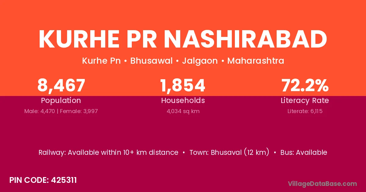 Bhusaval (12 km) is the nearest town to Kurhe Pr Nashirabad village for major economic activities and is located approximately 12 km away.
