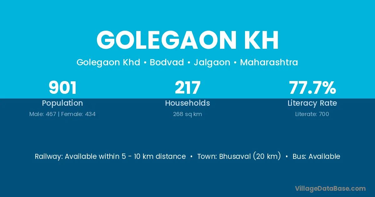 Bhusaval (20 km) is the nearest town to Golegaon Kh village for major economic activities and is located approximately 20 km away.