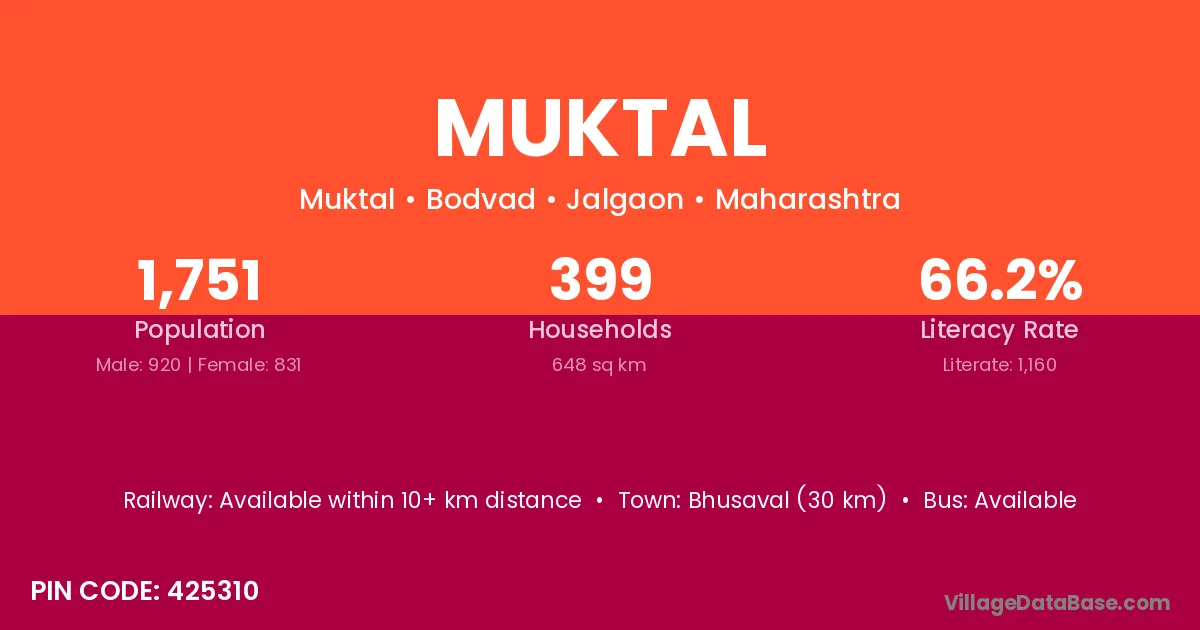 Bhusaval (30 km) is the nearest town to Muktal village for major economic activities and is located approximately 30 km away.