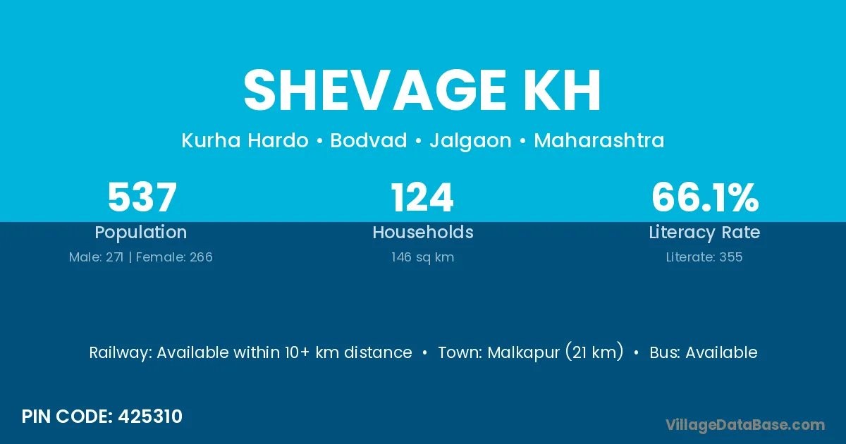 Malkapur (21 km) is the nearest town to Shevage Kh village for major economic activities and is located approximately 21 km away.
