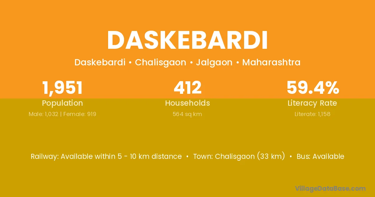 Chalisgaon (33 km) is the nearest town to Daskebardi village for major economic activities and is located approximately 33 km away.