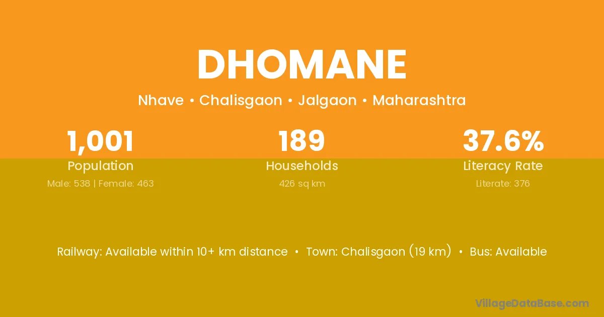 Chalisgaon (19 km) is the nearest town to Dhomane village for major economic activities and is located approximately 19 km away.