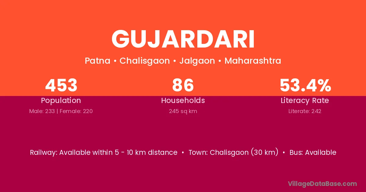 Chalisgaon (30 km) is the nearest town to Gujardari village for major economic activities and is located approximately 30 km away.