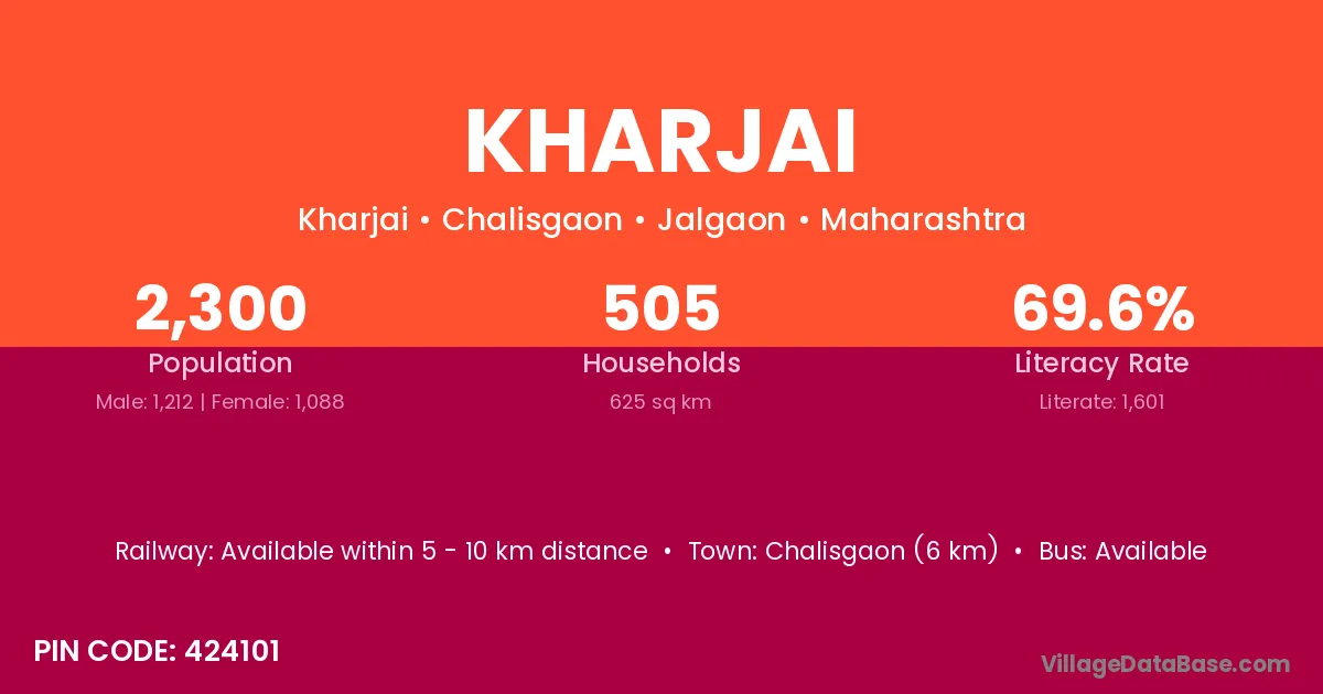 Chalisgaon (6 km) is the nearest town to Kharjai village for major economic activities and is located approximately 6 km away.