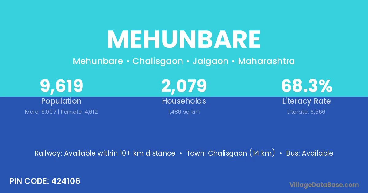 Chalisgaon (14 km) is the nearest town to Mehunbare village for major economic activities and is located approximately 14 km away.