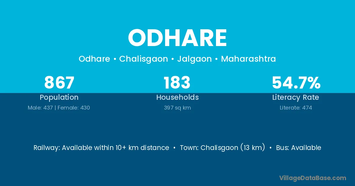 Chalisgaon (13 km) is the nearest town to Odhare village for major economic activities and is located approximately 13 km away.