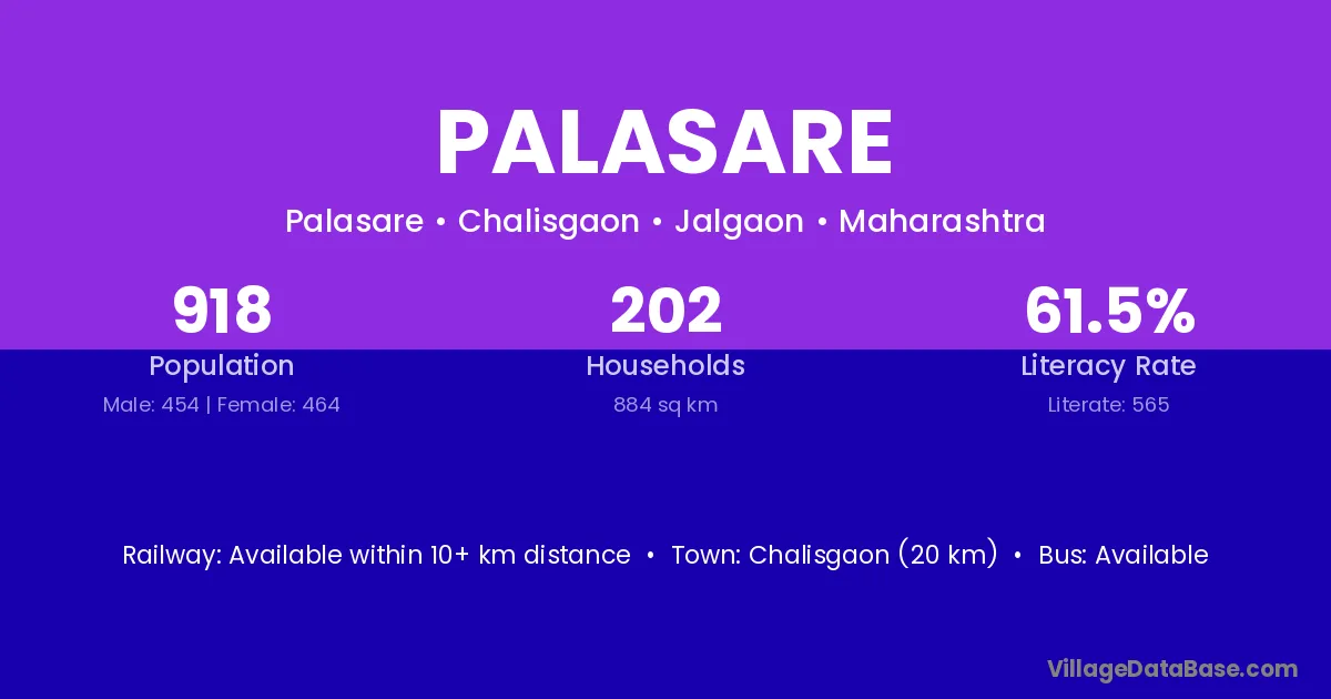 Chalisgaon (20 km) is the nearest town to Palasare village for major economic activities and is located approximately 20 km away.