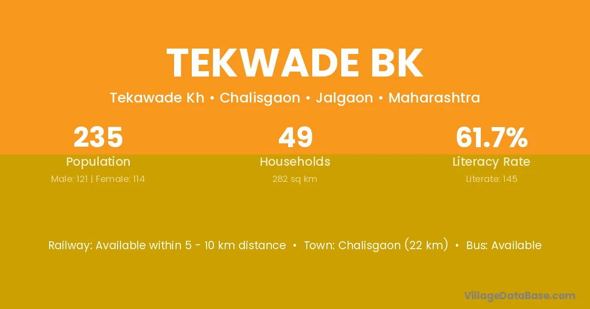 Tekwade Bk village has a total population of 235 people, of which 121 are males and 114 are females.