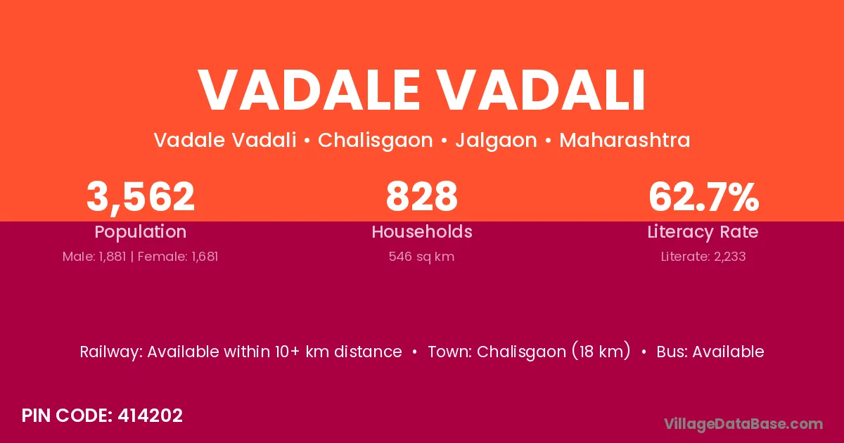 Chalisgaon (18 km) is the nearest town to Vadale Vadali village for major economic activities and is located approximately 18 km away.