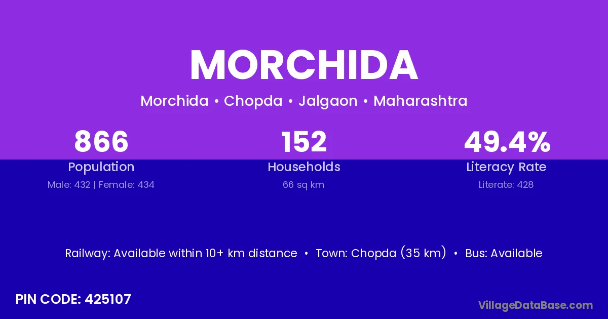 Chopda (35 km) is the nearest town to Morchida village for major economic activities and is located approximately 35 km away.