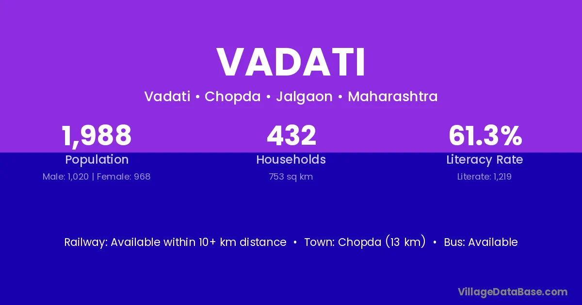 Chopda (13 km) is the nearest town to Vadati village for major economic activities and is located approximately 13 km away.