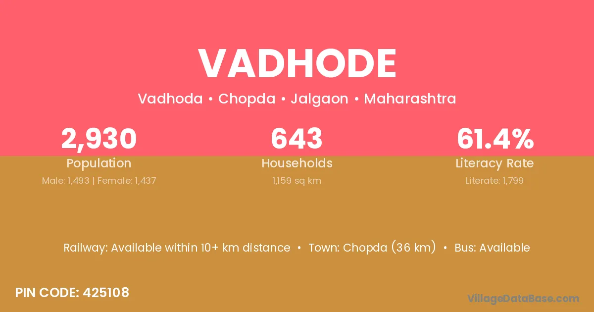 Chopda (36 km) is the nearest town to Vadhode village for major economic activities and is located approximately 36 km away.