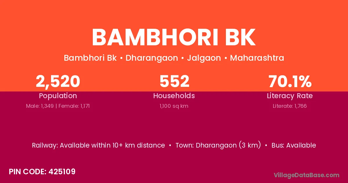 Dharangaon (3 km) is the nearest town to Bambhori Bk village for major economic activities and is located approximately 3 km away.