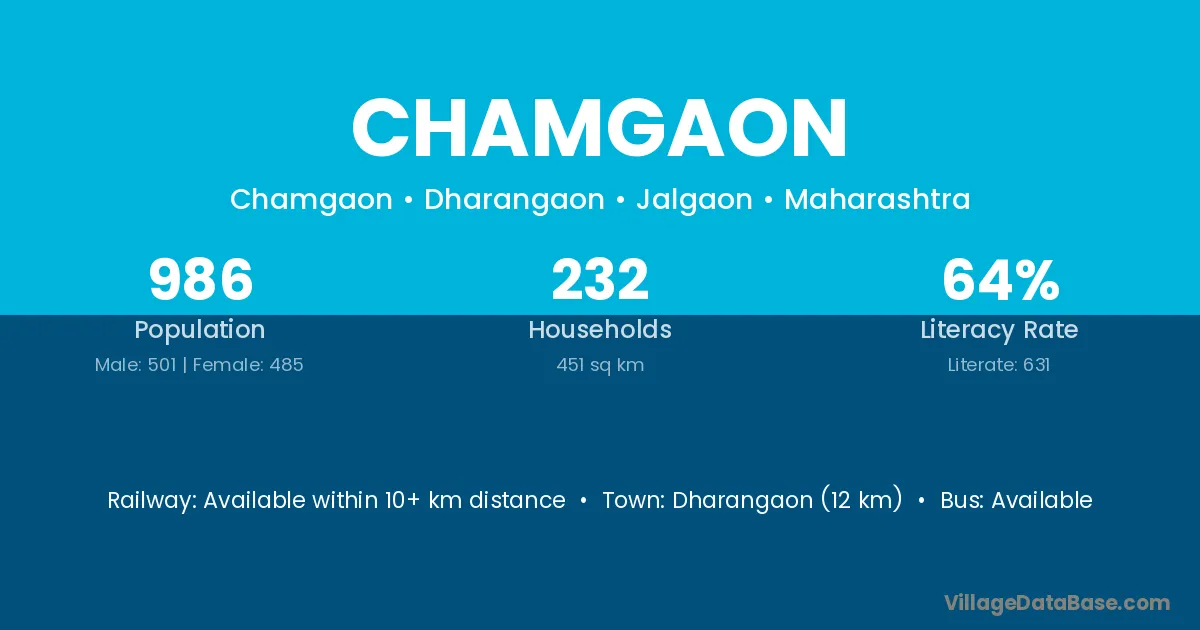 Chamgaon village has a total population of 986 people, of which 501 are males and 485 are females.