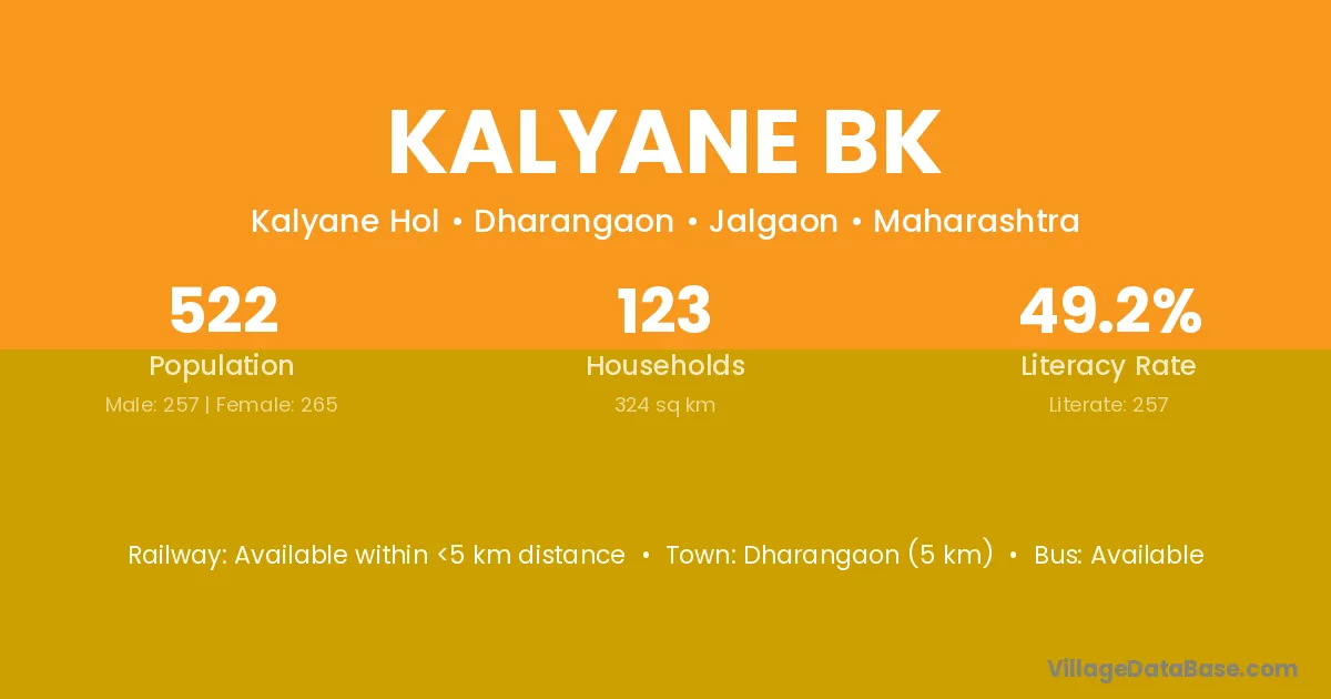 Dharangaon (5 km) is the nearest town to Kalyane Bk village for major economic activities and is located approximately 5 km away.