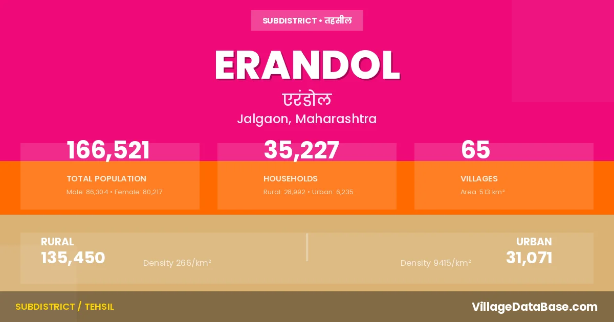 According to the 2011 census The total area of Erandol Tehsil is 513 km², with a population of 166521 people. The population density is 324 inhabitants per square kilometre, and there are approximately 35227 houses in the sub district.