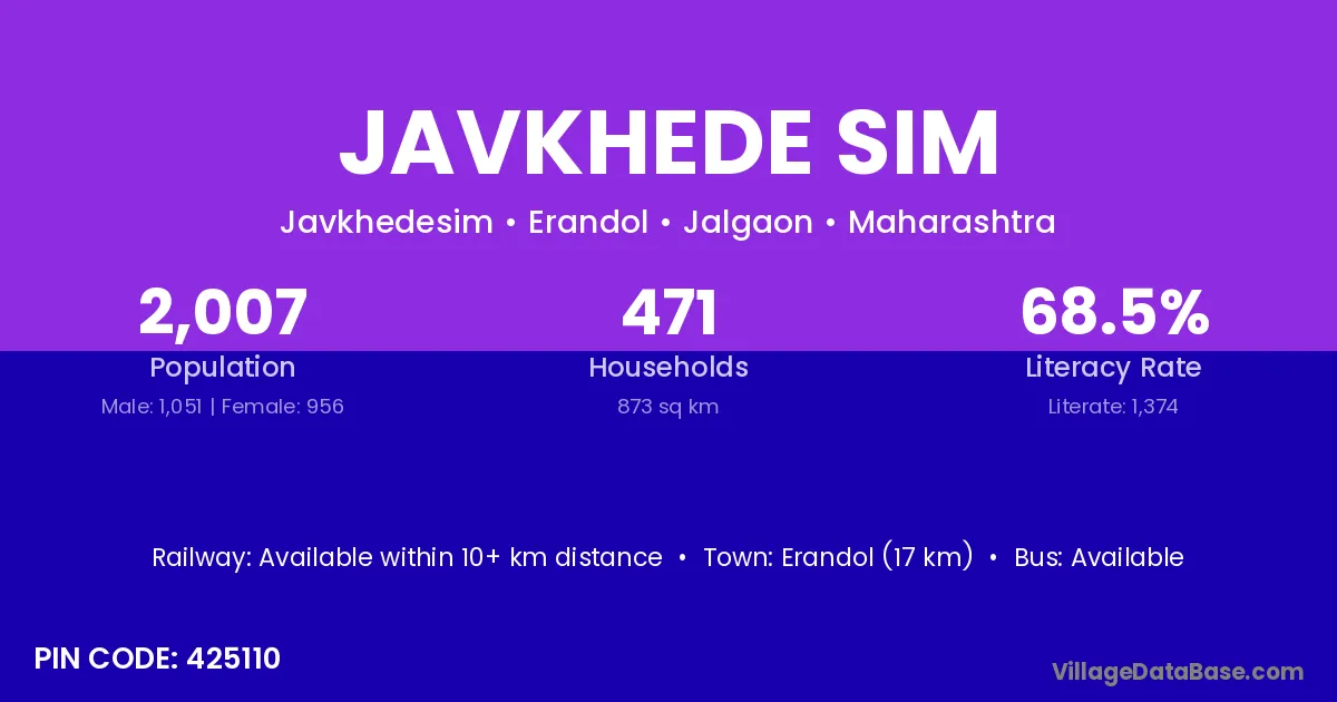 Erandol (17 km) is the nearest town to Javkhede Sim village for major economic activities and is located approximately 17 km away.