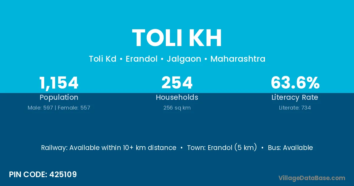 Erandol (5 km) is the nearest town to Toli Kh village for major economic activities and is located approximately 5 km away.