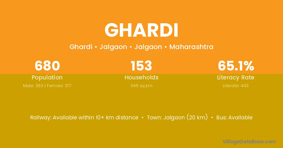 Jalgaon (20 km) is the nearest town to Ghardi village for major economic activities and is located approximately 20 km away.