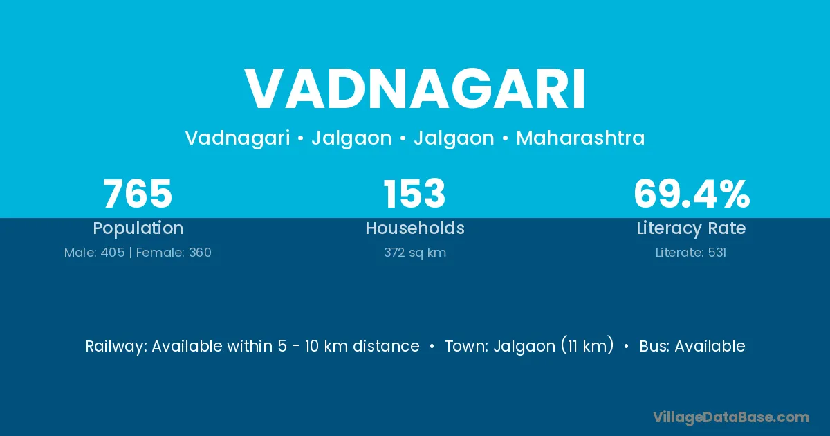Jalgaon (11 km) is the nearest town to Vadnagari village for major economic activities and is located approximately 11 km away.