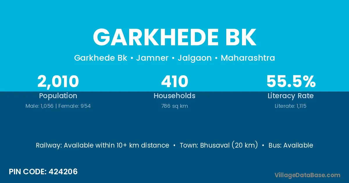 Bhusaval (20 km) is the nearest town to Garkhede Bk village for major economic activities and is located approximately 20 km away.