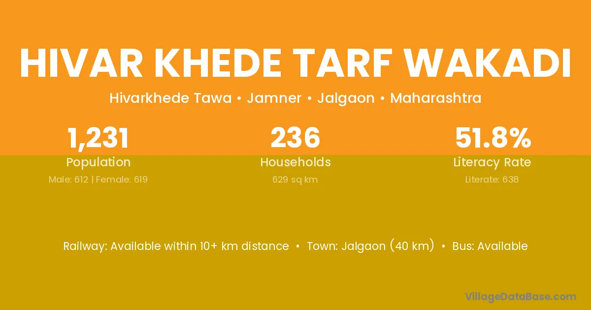 Hivar Khede Tarf Wakadi village has a total population of 1,231 people, of which 612 are males and 619 are females.
