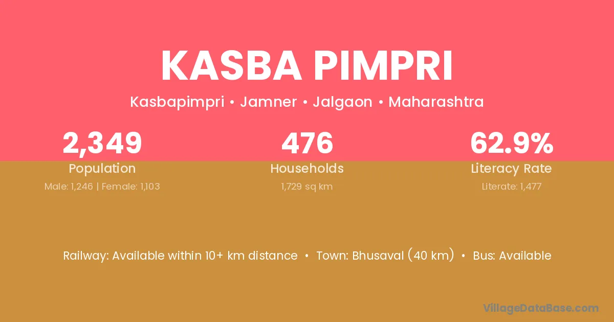 Bhusaval (40 km) is the nearest town to Kasba Pimpri village for major economic activities and is located approximately 40 km away.