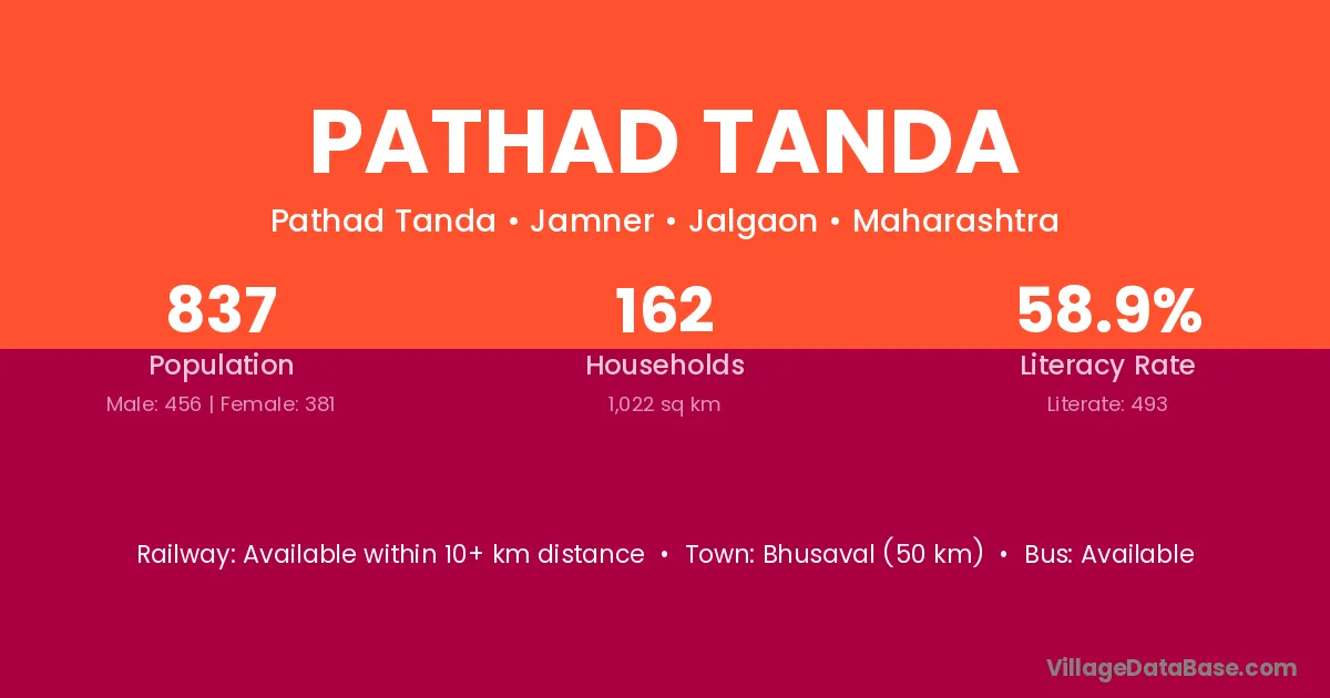 Bhusaval (50 km) is the nearest town to Pathad Tanda village for major economic activities and is located approximately 50 km away.