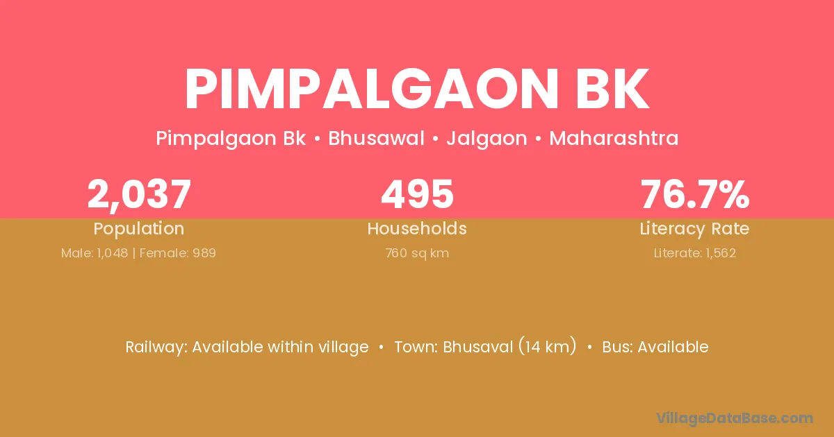 The literacy rate of Pimpalgaon Bk village is 61.44%. Male literacy stands at 69.52% and female literacy at 52.90%.