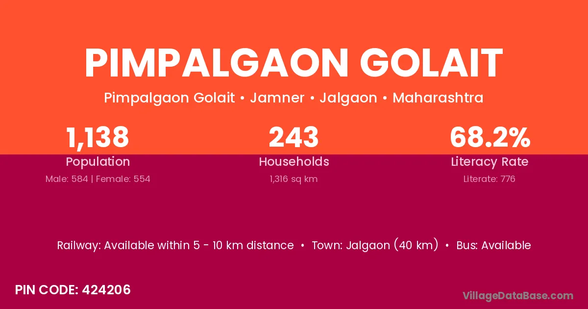 Pimpalgaon Golait village has a total population of 1,138 people, of which 584 are males and 554 are females.