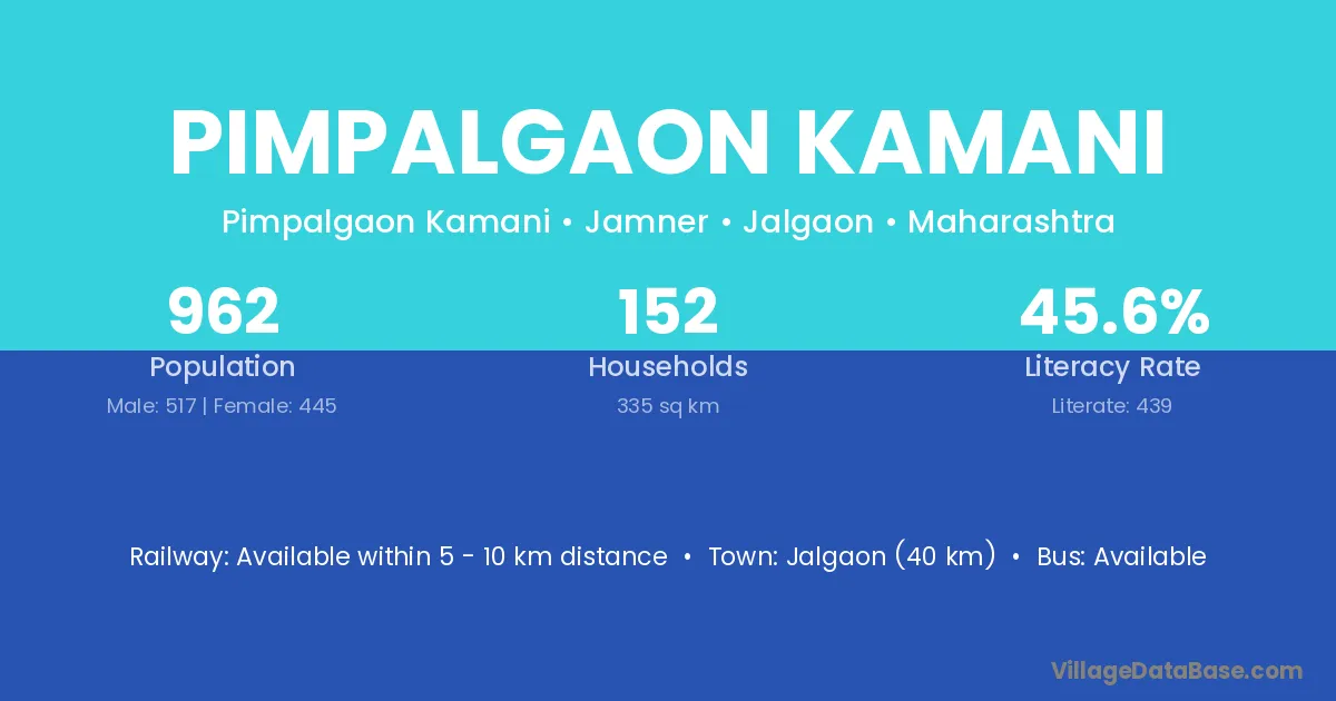 Pimpalgaon Kamani village has a total population of 962 people, of which 517 are males and 445 are females.