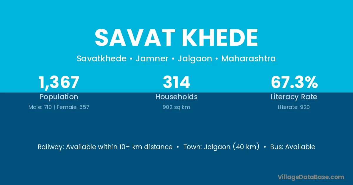 Jalgaon (40 km) is the nearest town to Savat Khede village for major economic activities and is located approximately 40 km away.