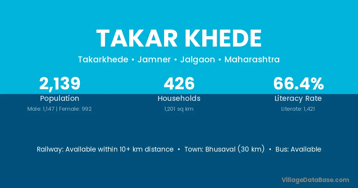 Bhusaval (30 km) is the nearest town to Takar Khede village for major economic activities and is located approximately 30 km away.