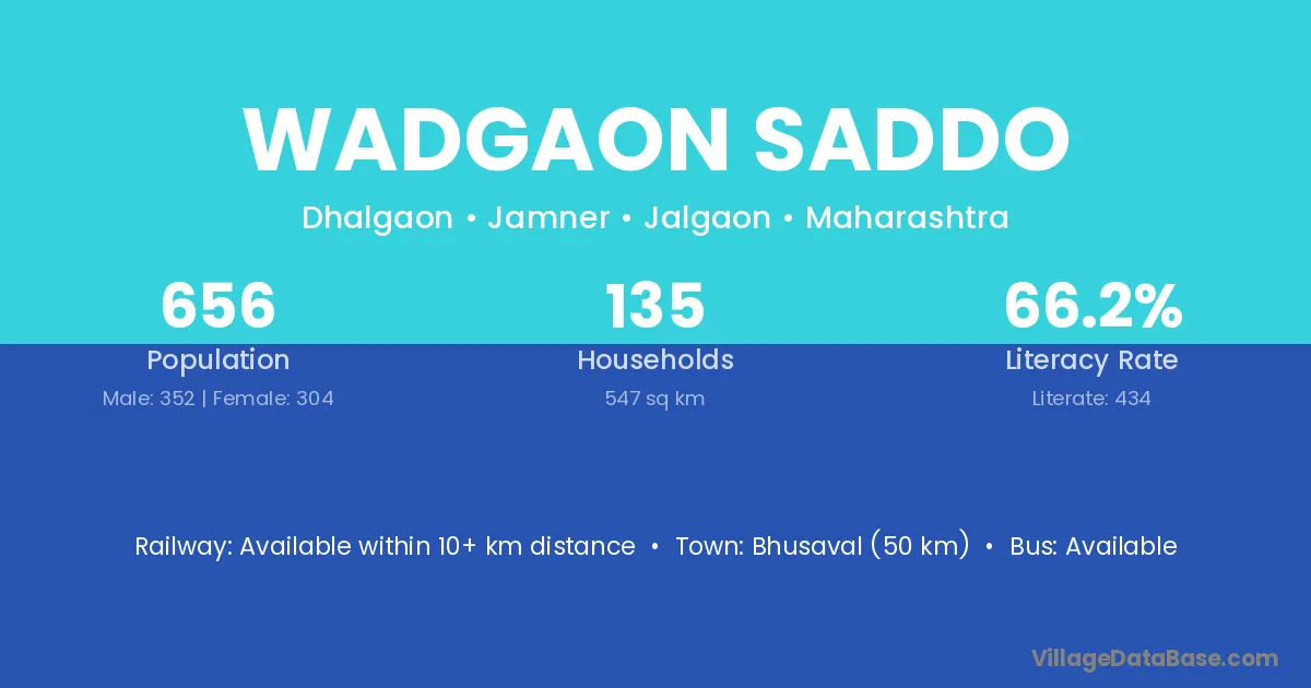 Bhusaval (50 km) is the nearest town to Wadgaon Saddo village for major economic activities and is located approximately 50 km away.
