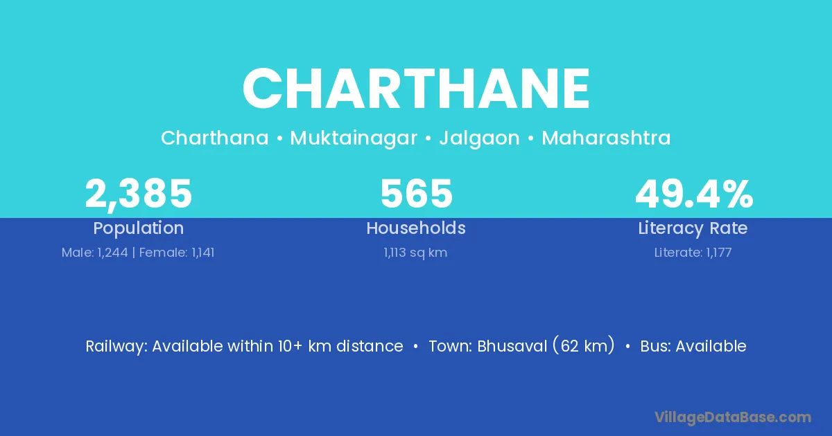 Bhusaval (62 km) is the nearest town to Charthane village for major economic activities and is located approximately 62 km away.