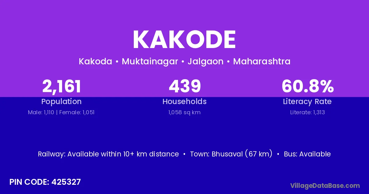 Bhusaval (67 km) is the nearest town to Kakode village for major economic activities and is located approximately 67 km away.